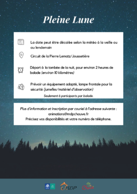 Des balades seront proposées lors des pleines lunes suivantes : 13/04/2025 – 12/05/2025 – 11/06/2025 – 10/07/2025.