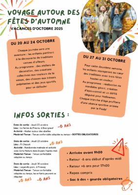 Première semaine : ils découvriront la richesse culturelle de la Fête de la Moisson, de la Fête de la Lune, de la Fête de l’Automne et du Dia de los Muertos. Entre ateliers de décoration, créations collectives aux couleurs de l’automne, chasses aux trésors et jeux sportifs, chaque journée sera une aventure pleine de rires et de découvertes.