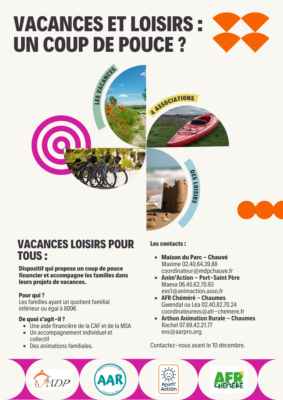 Le dispositif « VLPT » mis en place par la CAF et la MSA permet aux habitants, quelle que soit leur situation financière, d’imaginer et organiser un temps de loisirs ou de vacances, individuel ou en famille. Les associations Anim’Action (Port-Saint-Père), La Maison du Parc (Chauvé), Arthon Animation Rurale et l’AFR de Chéméré (Chaumes-en-Retz) s’allient pour accompagner les familles du territoire dans ce dispositif.