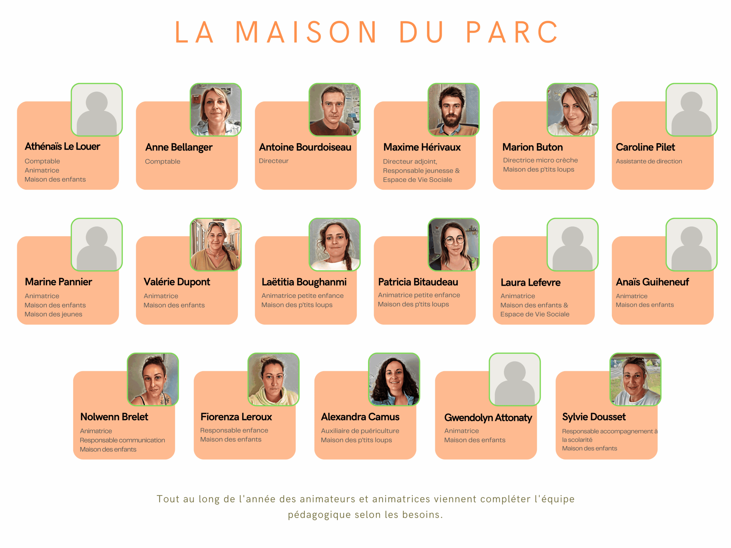 L’équipe de salariés est composée de seize salariés, répartis sur les postes suivants : un directeur ; un directeur adjoint ; une directrice microcrèche ; une responsable enfance ; une auxiliaire de puériculture ; deux animatrices petite-enfance ; huit animateurs et une comptable. Tous les salariés de l’association participent à l’organisation de tous les services de l’association. Ce fonctionnement permet aux familles d’avoir les mêmes interlocuteurs tout au long de l’année.