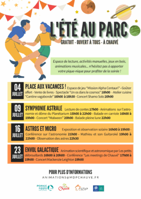 Pour cette quatrième édition de « L’ÉTÉ AU PARC », bien que la formule reste similaire aux années précédente, nous ne vous donnons pas vraiment rendez-vous dans le parc mais à mille kilomètres au dessus : Dans les étoiles !